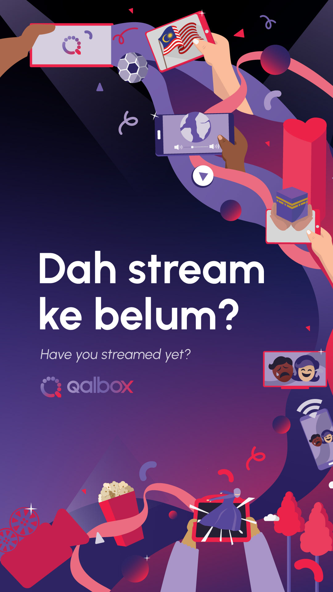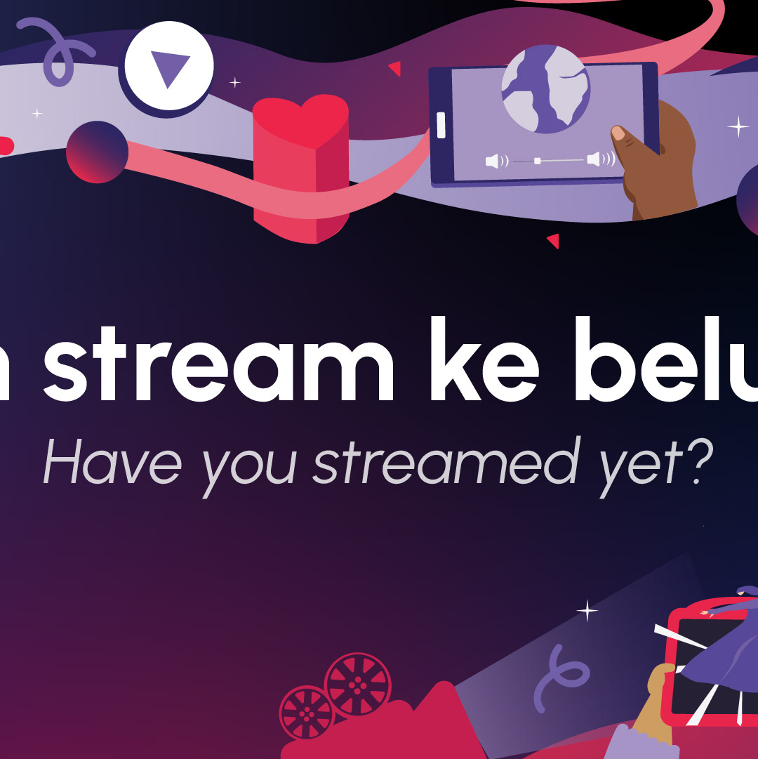 For the event invitations, I sought to integrate meaningful symbols that encapsulate the essence of Qalbox. The front features a clean and minimalist design with the tagline "Dah stream ke belum?" ("Have you streamed yet?"), intended to spark curiosity about our streaming service. On the back, I developed a detailed illustration incorporating symbols that represent various program genres, app features, and brand elements. This design aims to evoke a lively and engaging atmosphere, reinforcing the excitement of the launch.